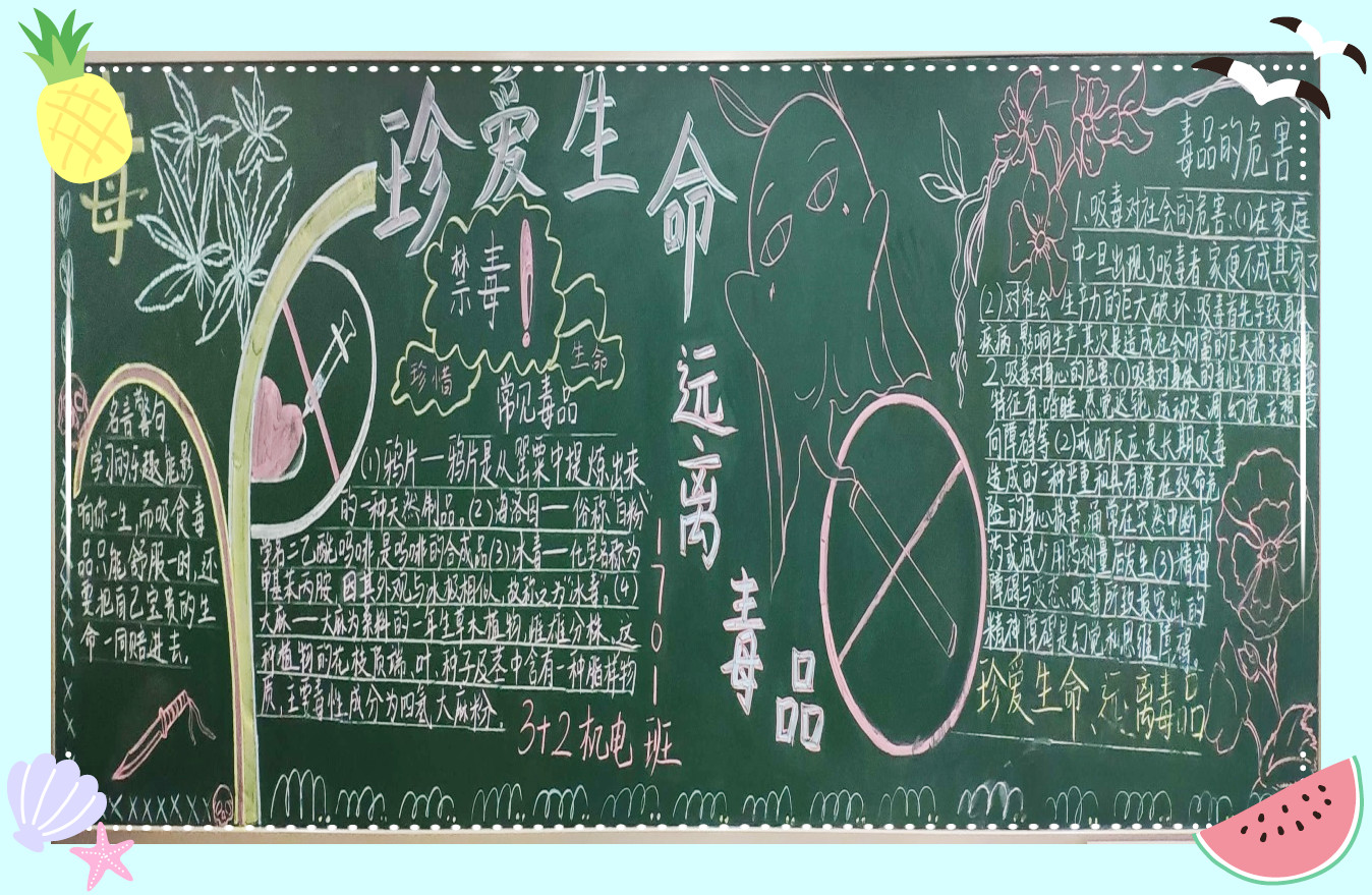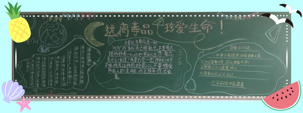 为进一步加大禁毒宣传教育力度,加强我校学生对毒品危害的认知度,提高学生对毒品危害的认识和自我保护的意识和能力。6月中旬,我校开展了以“禁毒教育”为主题的黑板报评比活动,本次的黑板报展示活动是“禁毒教育”主题班会的延续。