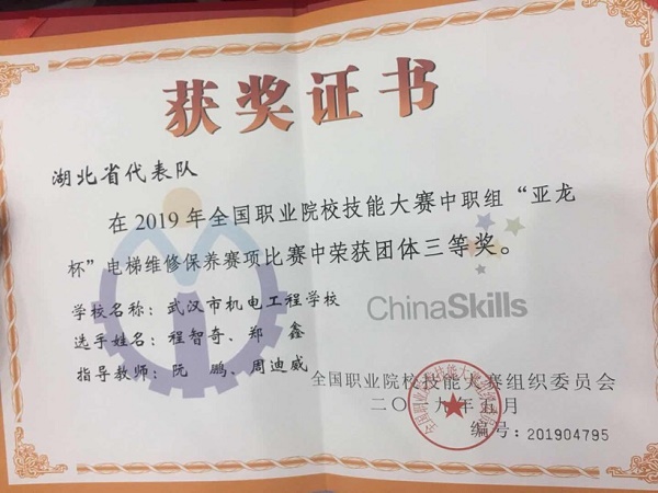 机电专业部:2019 年全国职业院校技能大赛中职组“电梯维修保养”比赛中荣获三等奖
