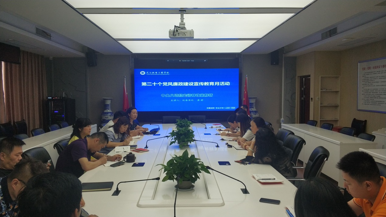 6月26日下午,在武汉机电工程学校第二十个党风廉政宣传教育月活动之际,行政党支部邀请学校党委委员、纪委书记龚蔚为支部党员干部上了一堂生动的廉政党课。