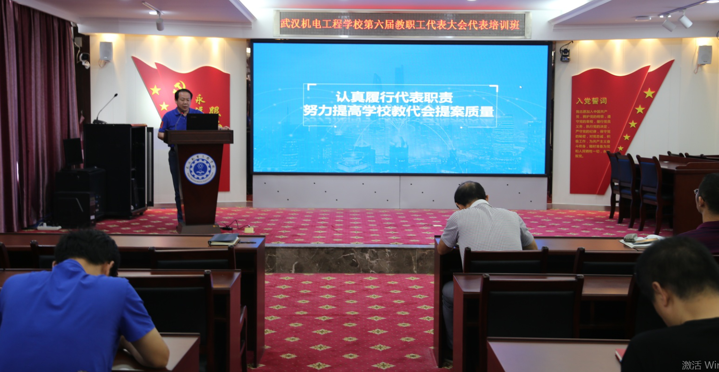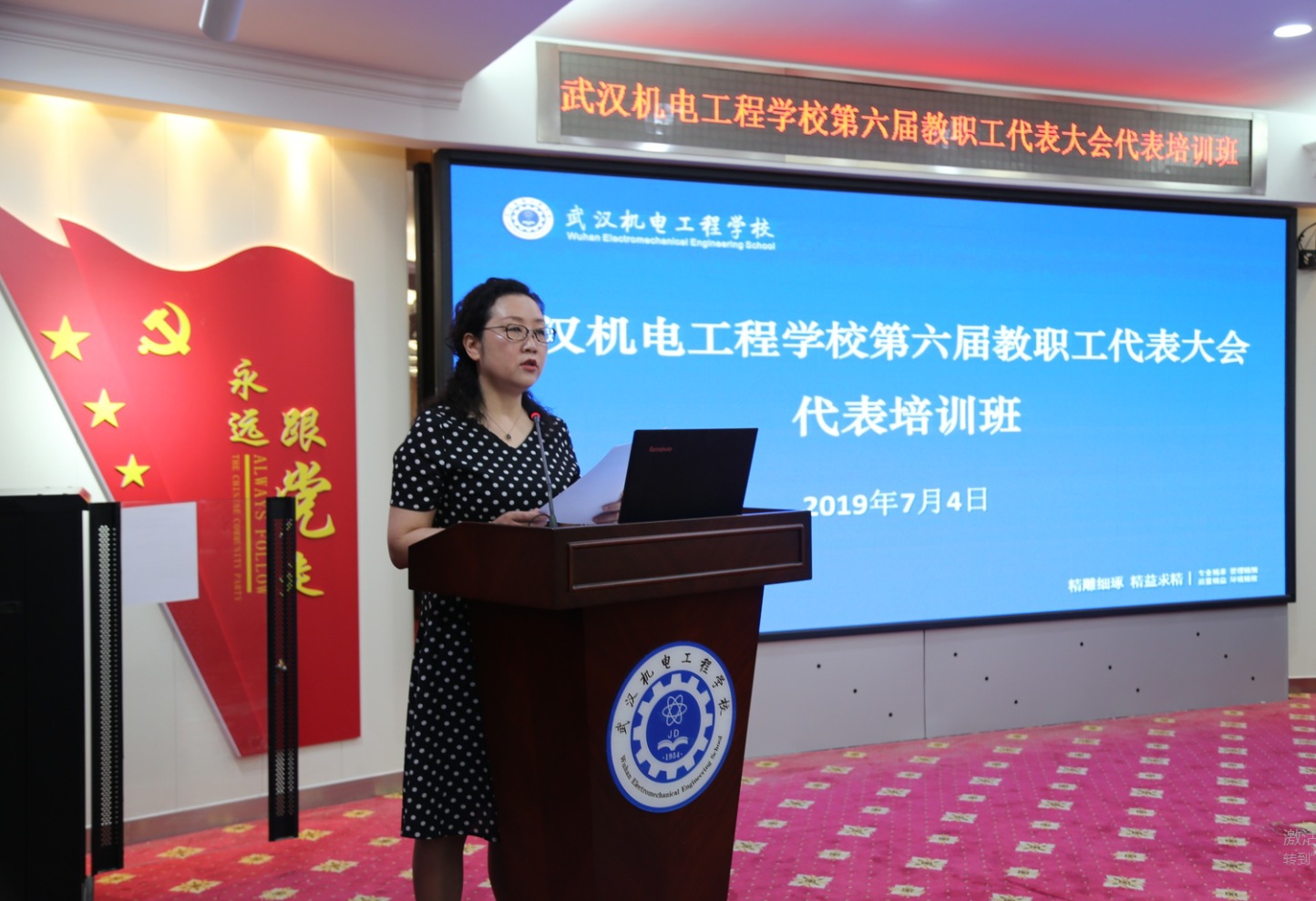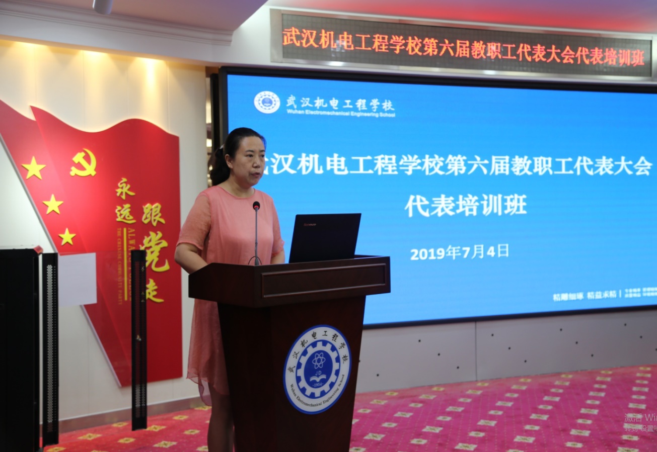 2019年7月4日上午,我校在综合楼五楼报告厅举行了武汉机电工程学校第六届教职工代表大会代表培训班。第六届教职工代表大会正式代表、工会小组长参加了此次培训班。工会主席龚蔚主持培训。