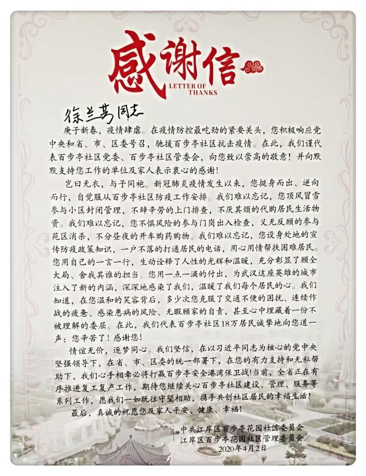 作为下沉干部和社区志愿者,她下沉建设新村社区,在百步亭社区志愿服务48天,参与12项志愿服务项目,服务人群1346人,不让一个辖区居民“落下”、不让一个村民“冲岗”。她曾经两天内在建设新村社区和百步亭社区辗转连轴服务超过24小时,她因工作出色获得“百步亭社区好人称号”。