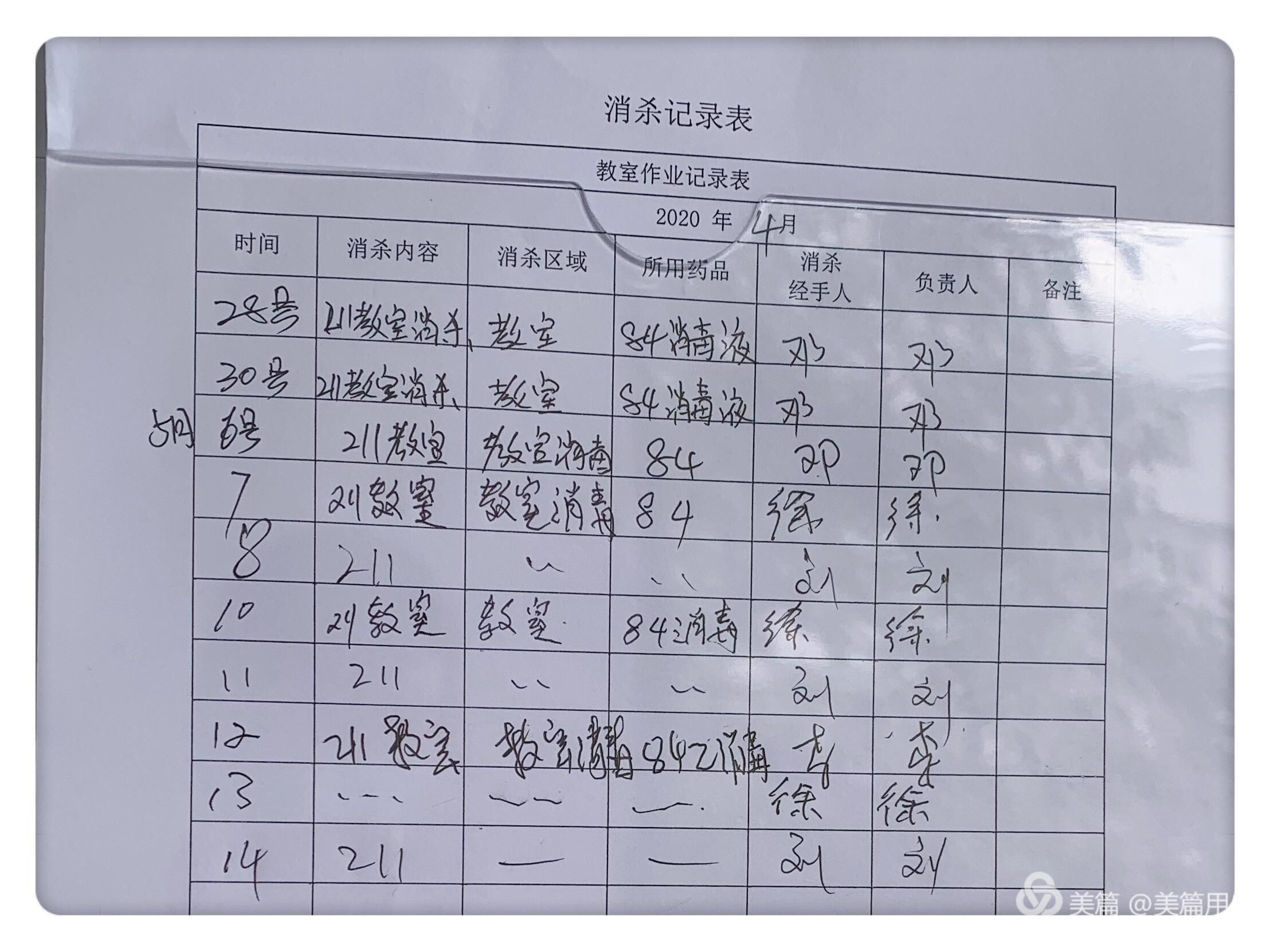 为持续有效做好学校的疫情防控工作,全方位落实校园环境日常消毒,切实保障师生生命安全和身体健康,复学前学校集中消毒,确保卫生达标。复学后学校全方位落实校园环境每天消毒记录制度,总务科严格按照消毒操作规范,重点对学生教室、实训场所、食堂、洗手间等公共区域进行消毒,并每天将消毒情况填入消毒记录登记表。