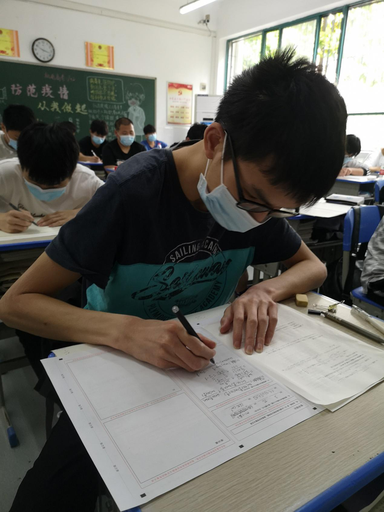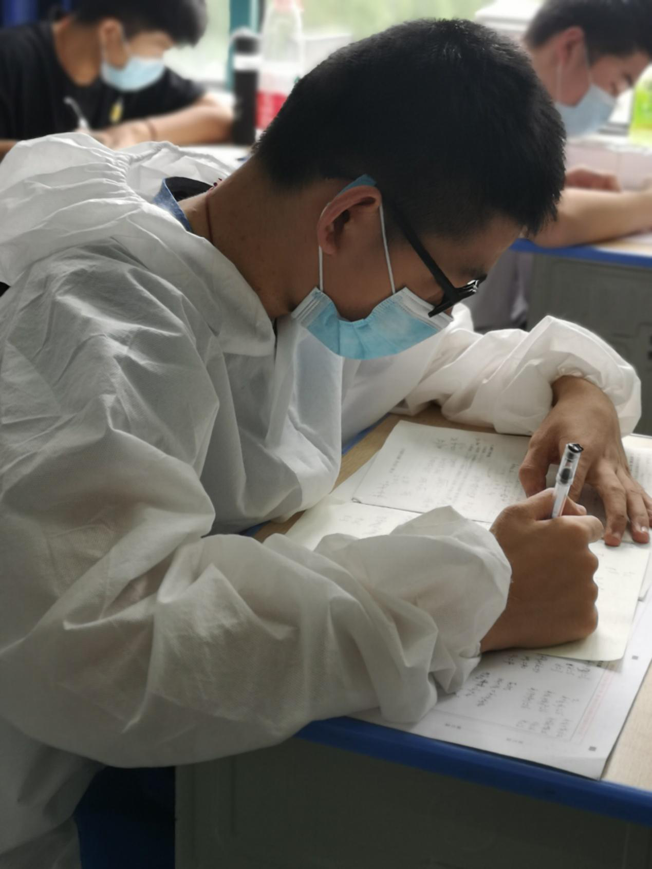 穿着防护服参加模拟考试的高三学子。