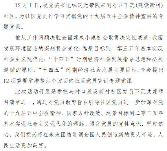 深入学习贯彻党的十九届五中全会精神——记武汉机电工程学校党委书记林汉元为对口下沉(建设新村)社区党员宣讲专题党课