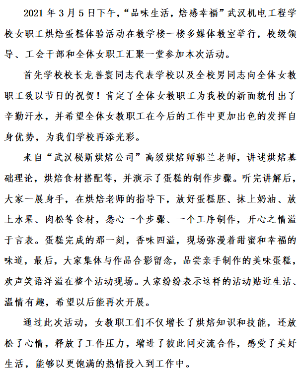 品味生活 焙感幸福 —— 武汉机电工程学校工会举办女职工蛋糕烘焙体验活动
