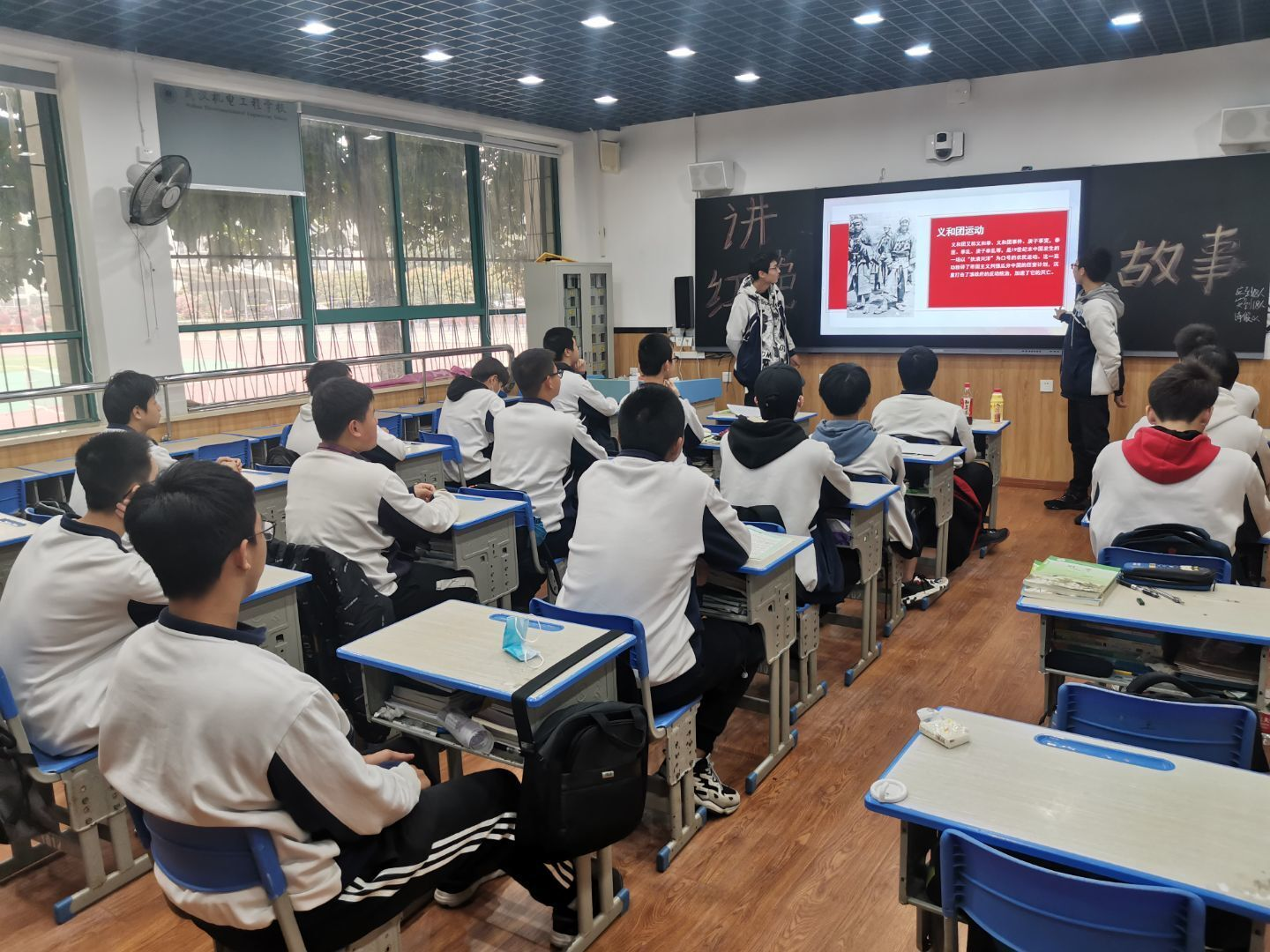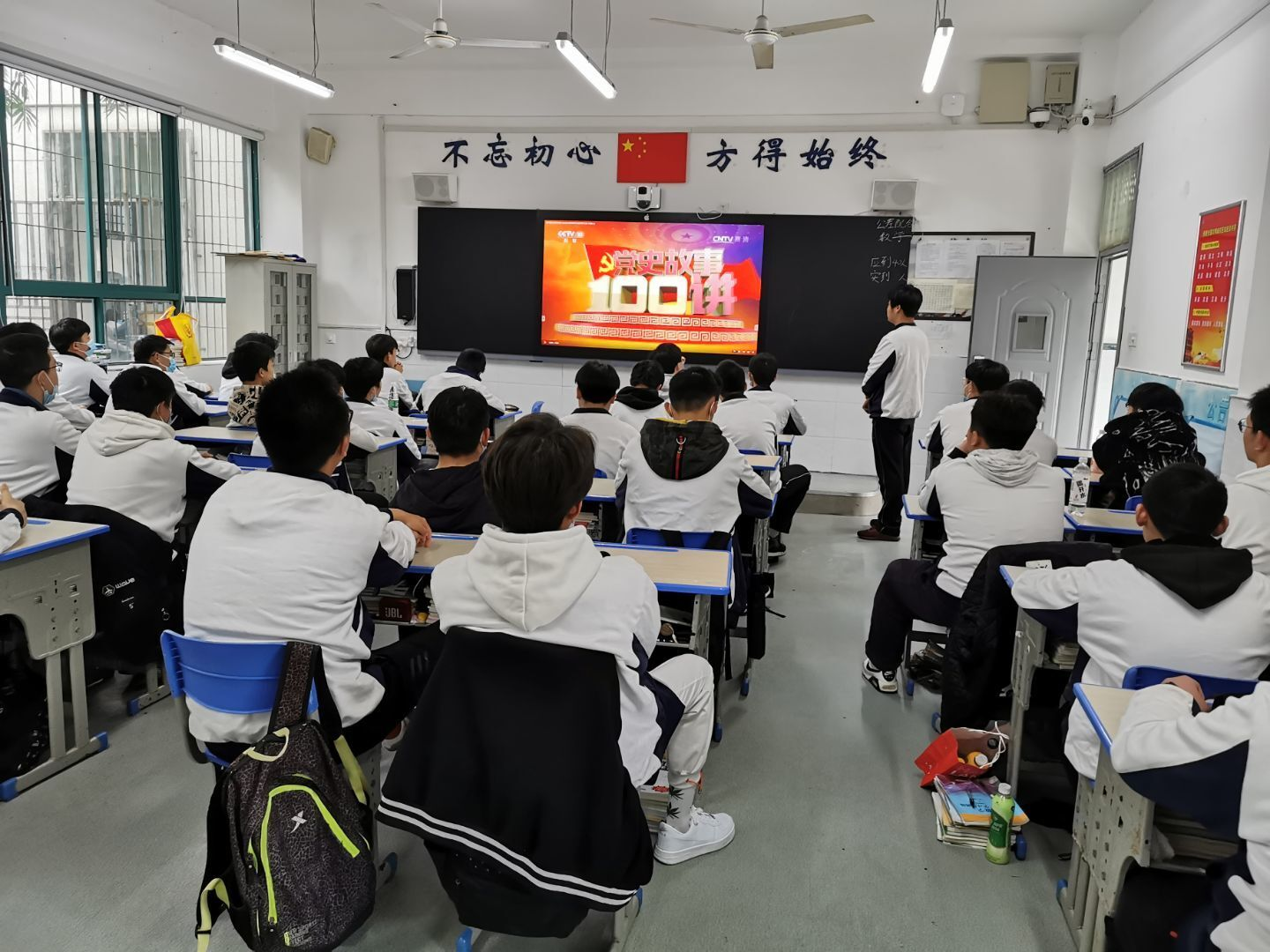 (班会课上学生观看党史故事)