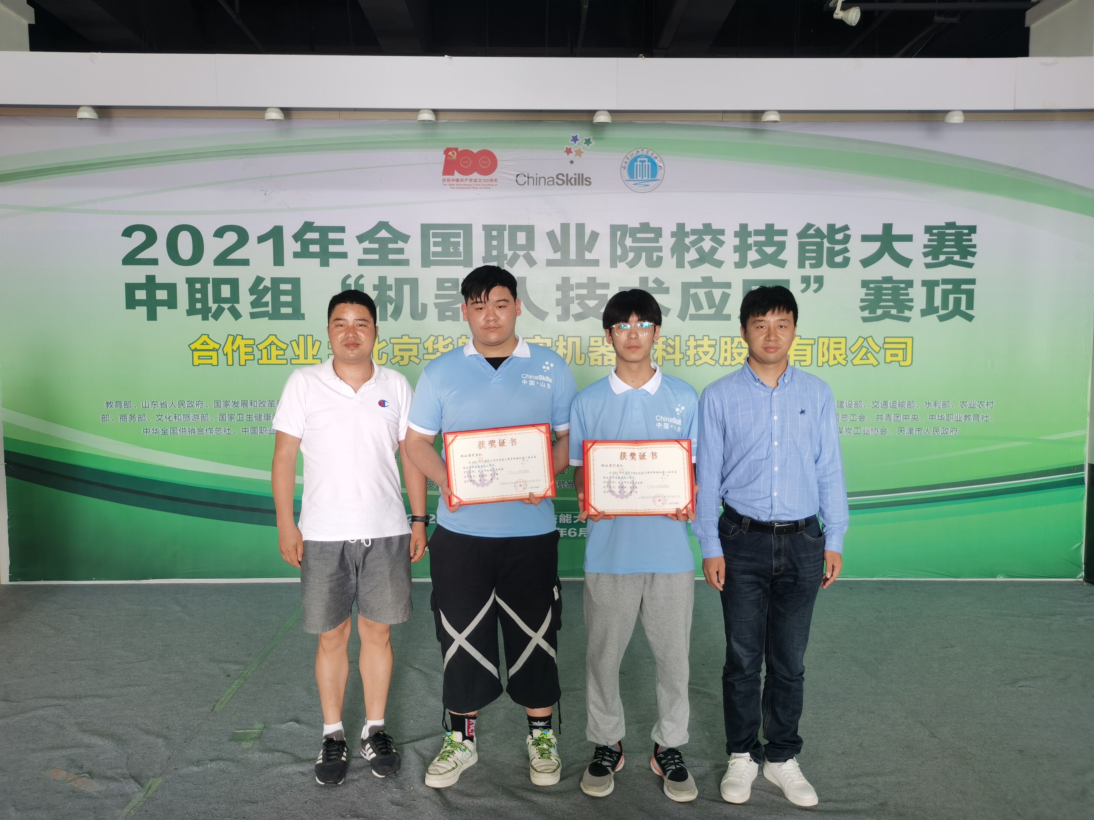 获奖学生童天曙、包鸿铭和指导教师黄伟、沈阳合影