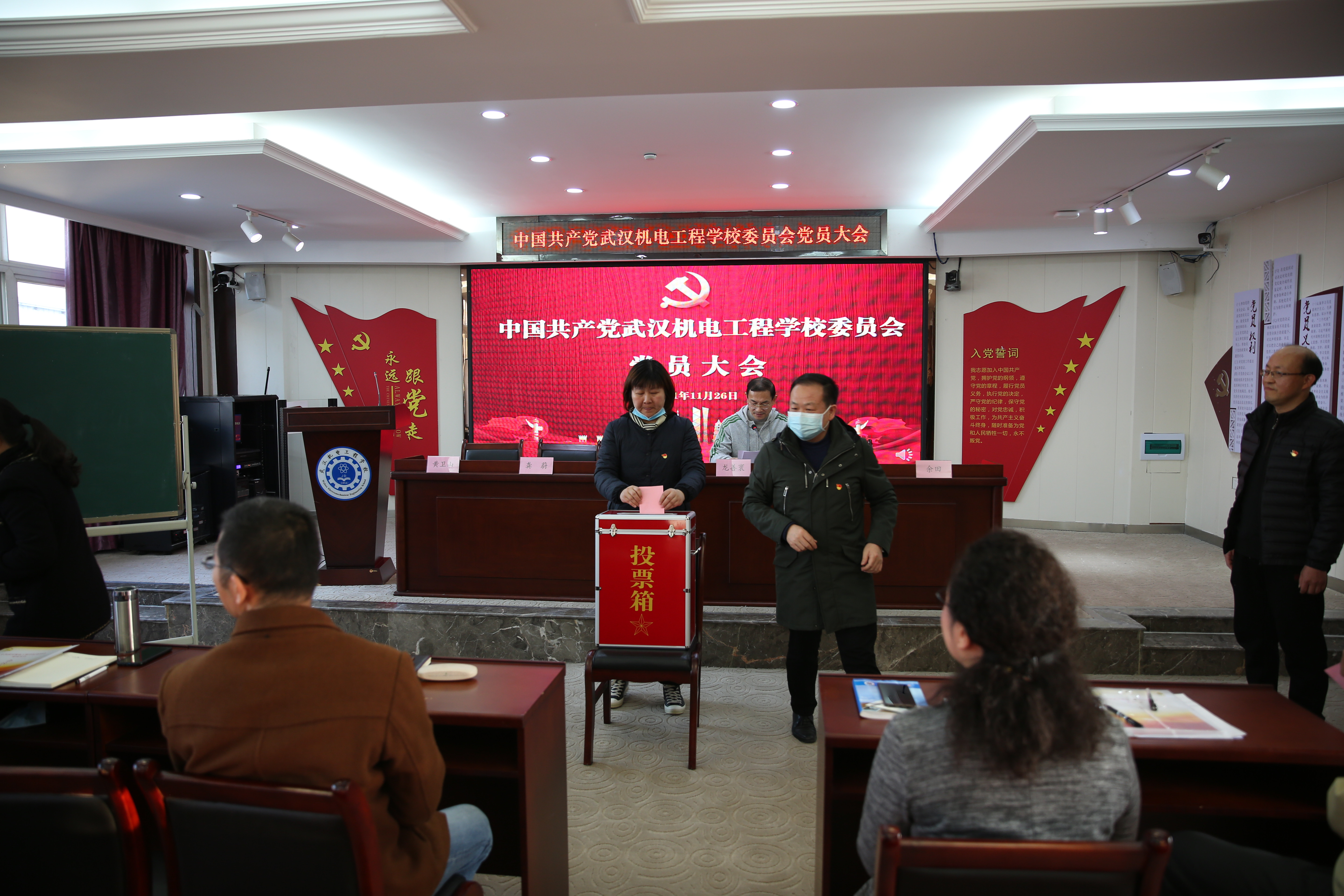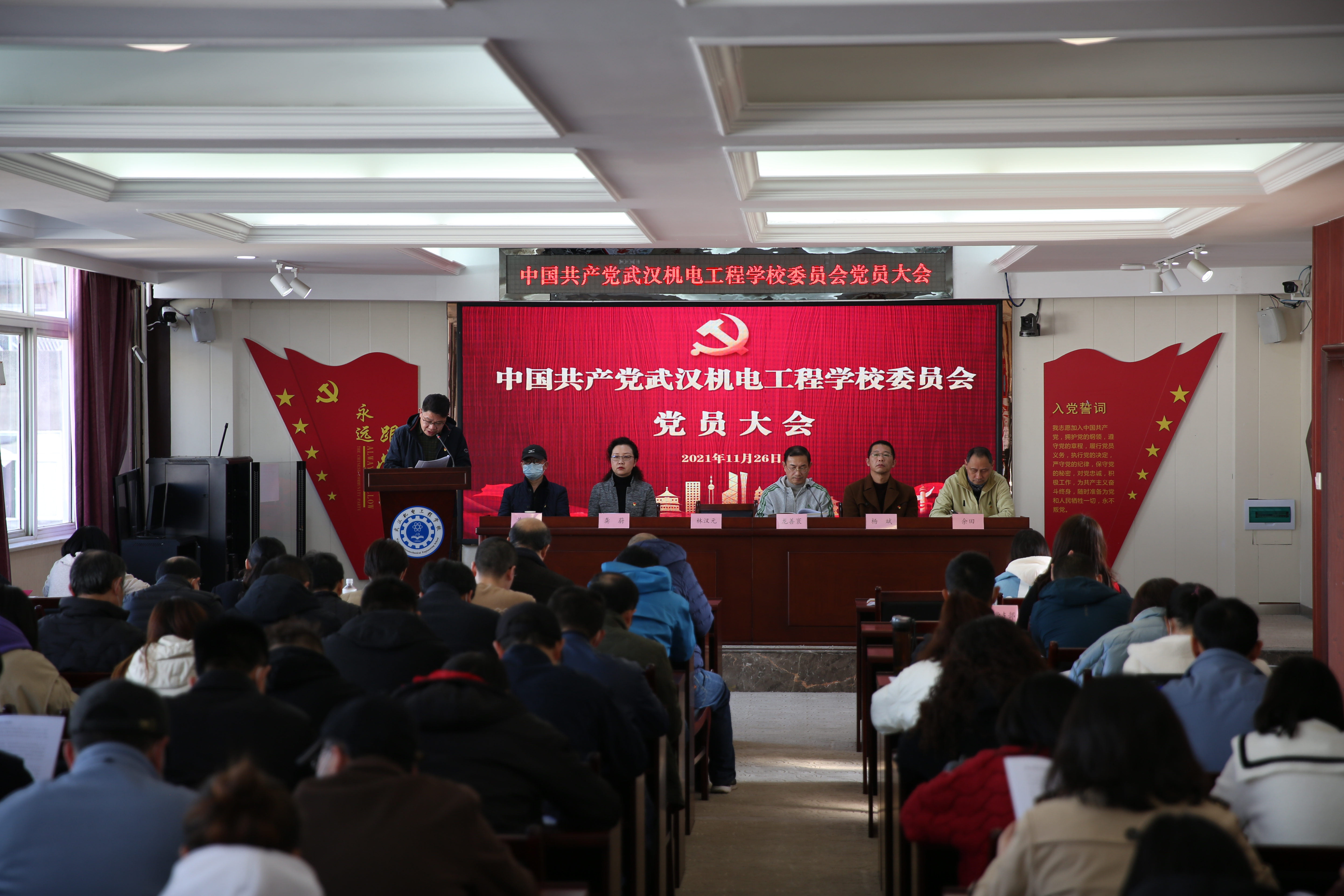 为加强我校基层党组织建设,保障党员民主权利,进一步完善党内选举制度,根据《中国共产党基层组织选举工作条例》以及《中国共产党章程》,我校于2021年11月26日下午2:40在综合楼五楼报告厅召开中共武汉机电工程学校委员会党员大会。会议由党委副书记、校长龙善寰主持,全体党员共91人出席了会议。