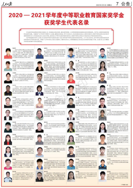 据长江日报消息,全国6万名优秀本专科学生荣获2020—2021学年度国家奖学金,全国2万名优秀中职学生获得2020—2021学年度国家奖学金。5月4日出版的人民日报,用四个整版刊登了100名本专科生国家奖学金获奖学生优秀代表和100名中等职业教育国家奖学金获奖学生优秀代表名录。