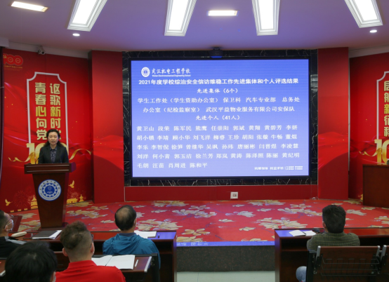 会上,副校长杨斌传达了上级安全工作文件精神并全面总结了2021年度综治安全信访维稳工作,部署了2022 年综治安全信访维稳工作要点;纪委书记兼工会主席龚蔚宣读了《2021年度综治安全信访维稳工作先进集体和先进个人评选结果的通报》;先进集体代表学生工作处副科长段荣、先进个人代表机电专业部副部长顾小华分享交流了工作做法和经验;党群工作部、总务处、机电专业部负责人依次上台代表各部门签订了《2022年综治安全责任书》。