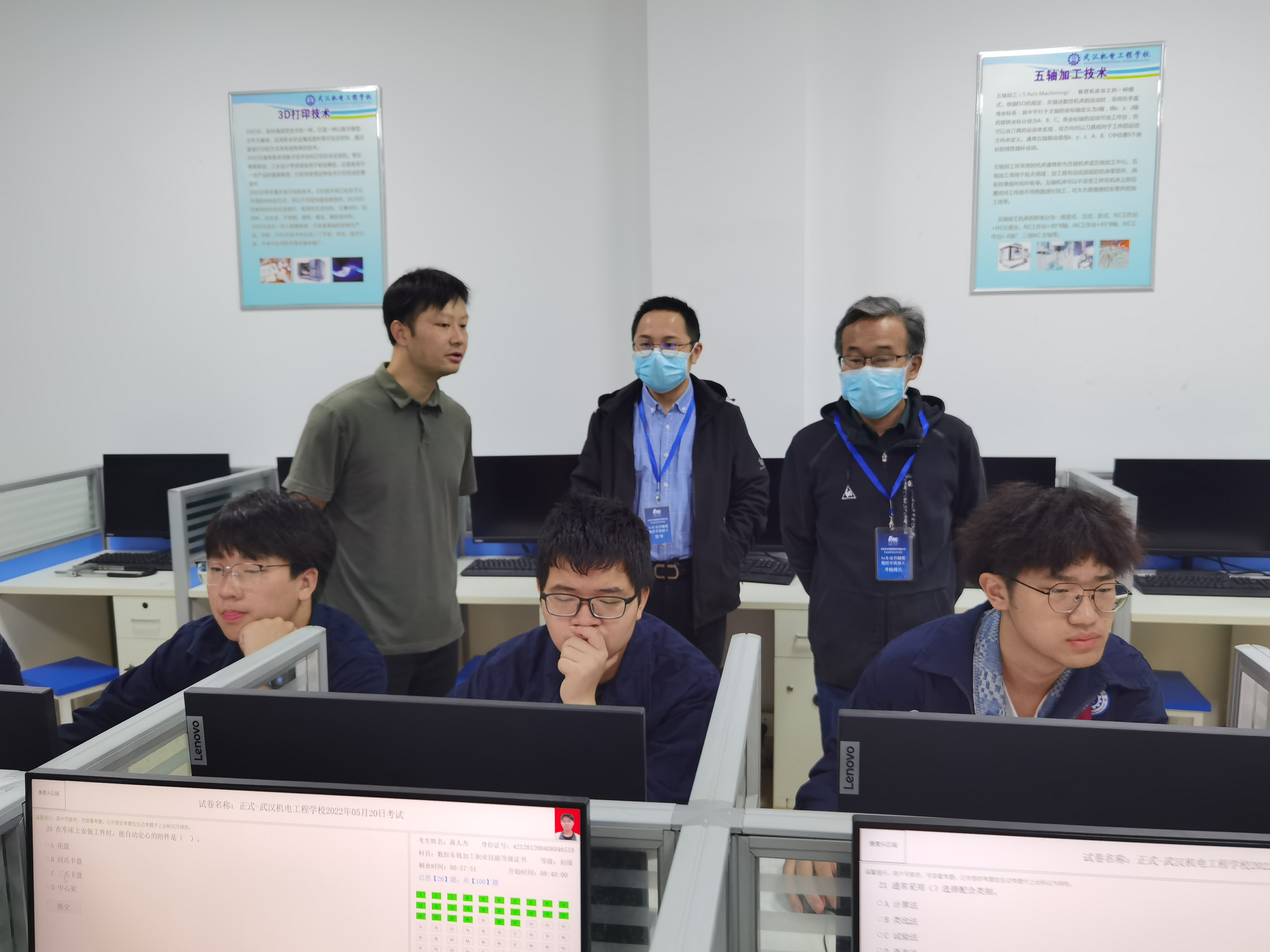石磊老师(左一)向1+X考核小组介绍考试情况