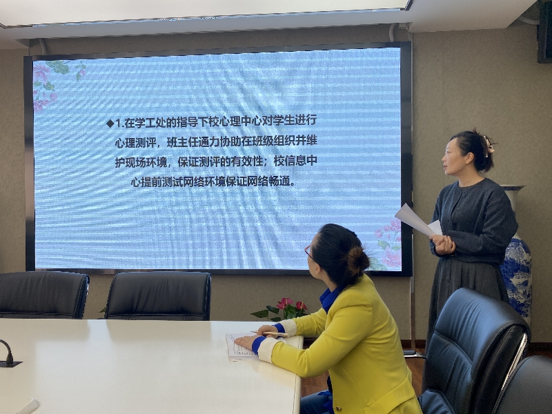 会议由学工处主任段荣主持。会议由孙校长做开场致词,段主任对学生心理健康工作做了整体汇报与工作总结,后由学校心理健康中心马老师对此次学生心理健康筛查情况进行了汇报。