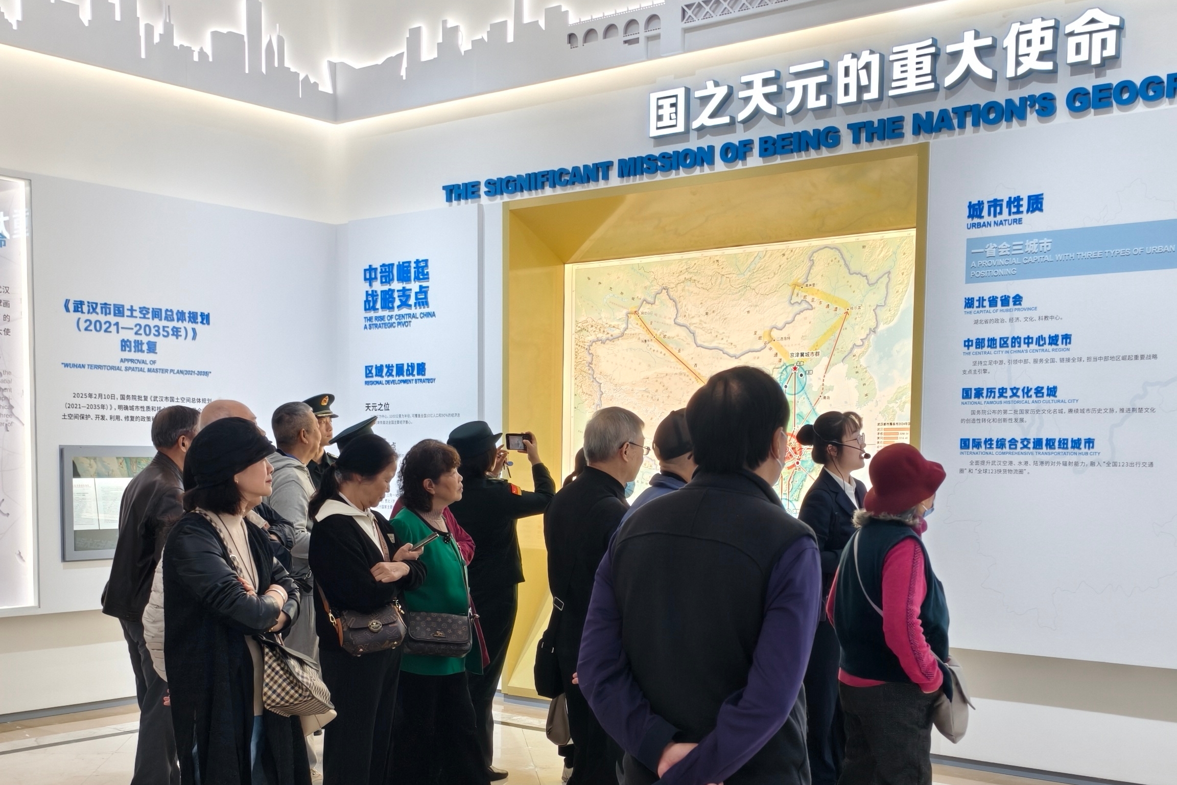 党委书记林汉元代表学校向离退休教师表达节日的祝愿,并谈到,学校在时代的浪潮中不断前行,各项事业蓬勃发展都离不开老教师们曾经打下的基础,学校将一如既往地重视离退休职工工作,不断完善服务保障体系,让老教师感受到学校的关怀与温暖。随后,在讲解员的带领下,离退休教师们依次参观了城市印象大厅、城市长廊、黄鹤楼重建历史、武汉交通规划体系、两江四岸微缩模型等主要展区,在总体规划模型厅内观看了宣传片,以一场沉浸式视听形式,亲身感受着武汉日新月异的变化。