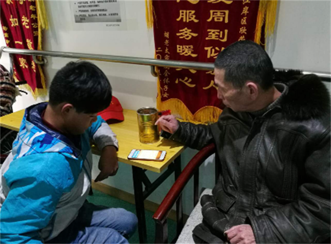 志愿者韩昱与敬老院的老人下棋