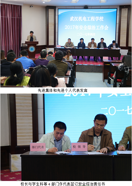 会上杨斌副校长传达了上级有关安全综治工作的精神,总结了2016年学校安全综治工作的完成落实情况,并对新一年度的安全综治工作进行了部署;会议对2016年度安全综治先进集体和先进个人进行了表彰;学生科等四部门作为二级责任人代表与龙校长签订了《安全综治责任书》。