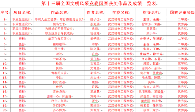 2017年5月,第十三届全国文明风采竞赛成绩揭晓,我校共有20件作品荣获国赛奖项,其中荣获6个二等奖,5个三等奖,9个优秀奖,获奖作品总数名列武汉市及湖北省第一。我校也因此作为湖北省优秀代表受邀出席全国文明风采竞赛总结展演活动。