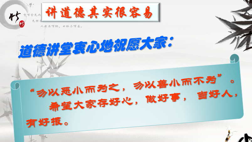 为深入学习贯彻党的十八大精神,践行社会主义核心价值观,不断提升我校师生的道德素质,营造 “讲道德,做好人,树新风”的浓厚氛围,在行政工作党支部、教务二支部和团委的组织下,我校师生128人,于2017年6月1日下午开展了 “道德讲堂”活动。本次道德讲堂邀请了教务二支部的林秀英书记主持,以道德讲堂与身边的好人相结合,分“做自我反思,唱一首歌曲,看道德短片,讲身边故事,诵道德经典,发道德倡议,送美好祝福”七个环节,在宣读倡议书的环节,行政工作党支部的范红杰书记总结本次活动,再一次宣扬了道德和我国传统文化的重要性,告诫莘莘学子们从平日注意自身文明规范,做一名不愧于礼仪之邦美名的华夏子孙。这次道德讲堂活动,让学生们接受了一次心灵洗礼,学会“忠孝仁义礼智信”,在实践与体验中得到成长。学校将继续通过道德讲堂,让师生分享身边好人的道德故事,分享身边好人的道德感悟,构建和谐文明的校园。