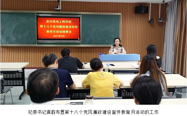 会上,纪委书记龚蔚布置了学校第十八个党风廉政建设宣传教育月活动的相关工作,进一步明确纪检干部的职责和工作任务。今年党风廉政宣传教育月活动内容丰富,一是开展《准则》《条例》集中学习宣传,组织《党章》《准则》《条例》知识测试;二是开展警示教育活动,组织党员干部观看警示教育片、组织党员干部集中学习教育领域违纪违法干部《忏悔录选编》、组织党员干部参观湖北省反腐倡廉警示教育展览;三是开展廉政文化进校园主题活动。