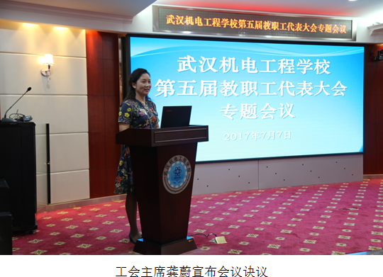专题会议中,代表们听取和审议了校长龙善寰同志所作的《武汉机电工程学校南校区建设规划设计方案》、校工会委员周志文同志所作的《武汉机电工程学校教职工代表大会提案工作实施办法》。会议认为两项议题是结合了学校实际情况,经过校办公会充分酝酿,校党委会集体研究,教代会代表组长座谈会专题讨论,各代表组长广泛征求教代会代表和职工意见、建议的基础上,多次修订形成的,符合广大教职工意愿,有利于学校未来的建设和发展。全体代表以举手表决方式,通过《武汉机电工程学校南校区建设规划设计方案》和《武汉机电工程学校教职工代表大会提案工作实施办法》。