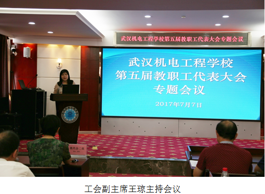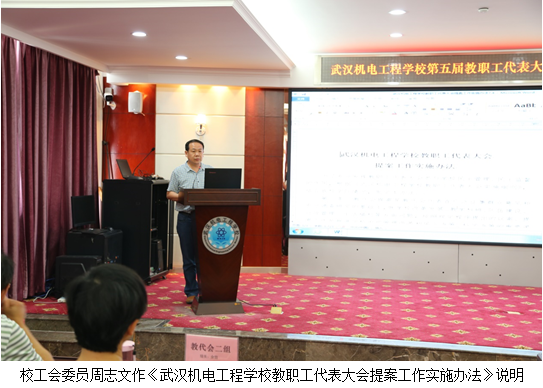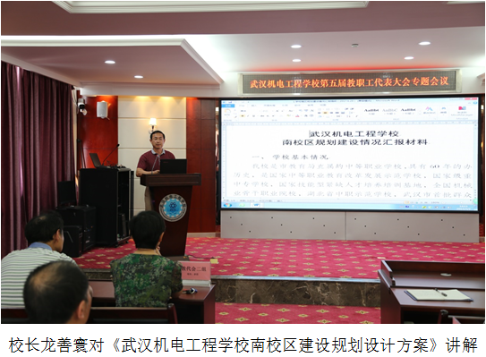 专题会议中,代表们听取和审议了校长龙善寰同志所作的《武汉机电工程学校南校区建设规划设计方案》、校工会委员周志文同志所作的《武汉机电工程学校教职工代表大会提案工作实施办法》。会议认为两项议题是结合了学校实际情况,经过校办公会充分酝酿,校党委会集体研究,教代会代表组长座谈会专题讨论,各代表组长广泛征求教代会代表和职工意见、建议的基础上,多次修订形成的,符合广大教职工意愿,有利于学校未来的建设和发展。全体代表以举手表决方式,通过《武汉机电工程学校南校区建设规划设计方案》和《武汉机电工程学校教职工代表大会提案工作实施办法》。