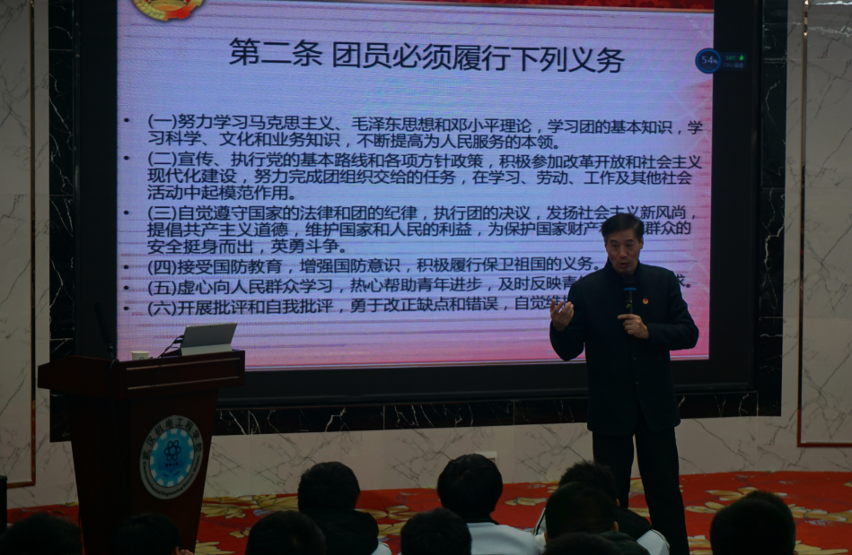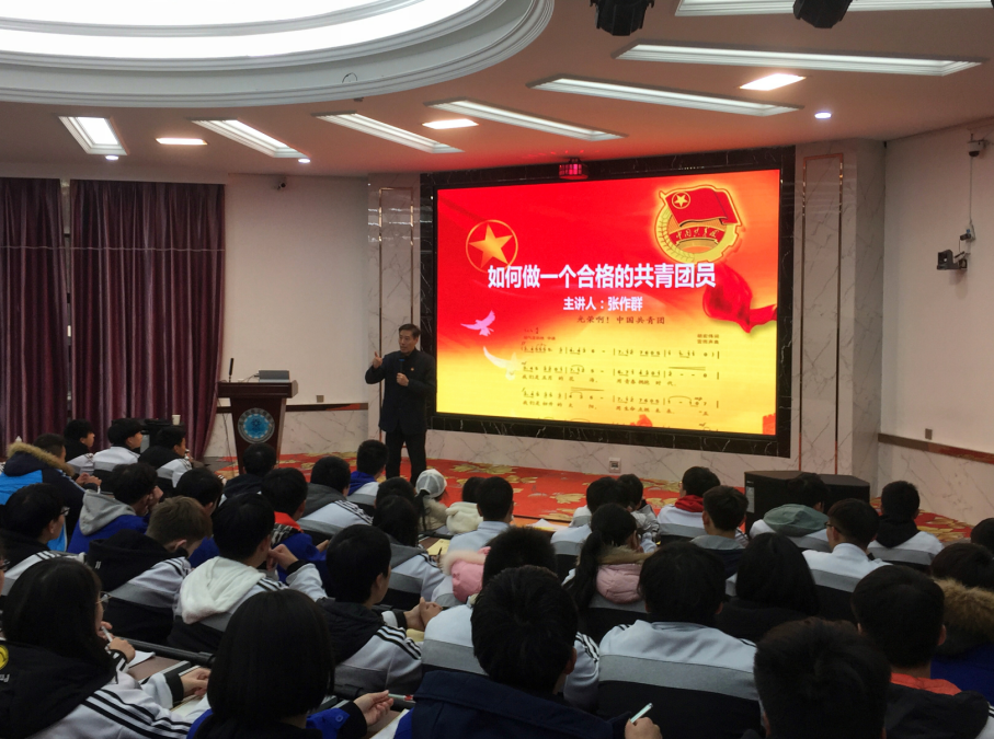 为切实增强我校团员的先进性和使命感,培养更加优秀的共青团员,在校团委的精心组织下,于2017年12月12日下午,邀请到来自武汉市团校张作群老师,以围绕“学习团章团史做合格共青团员”为主题的团课。