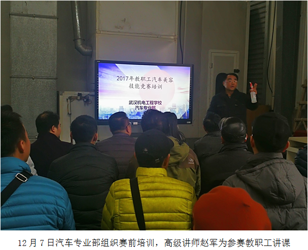 汽车专业技能竞赛汽车美容比赛项目中,有32名教职工以抽签方式分组,组成9个小组,以团队形式参加比赛。比赛前,汽车专业部组织的赛前培训实操性强,教职工受益匪浅。比赛中,尽管当天气寒冷,室外最低气温零下5度,也阻止不了参赛教职工的比赛热情,更挡不住汽车专业部赛场裁判员的服务热情。经过评委认真评选,有3个小组分别荣获一、二、三等奖。