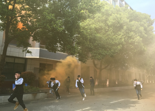 下午3:20时,学校灾害警报(模拟)响起,模拟现实灾害场景,教师带领学生迅速有序地从教学楼疏散到操场进行逃生。