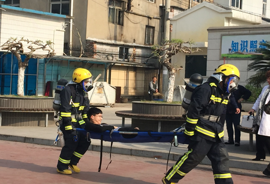 消防官兵从火灾现场(模拟)抢救受伤学生
