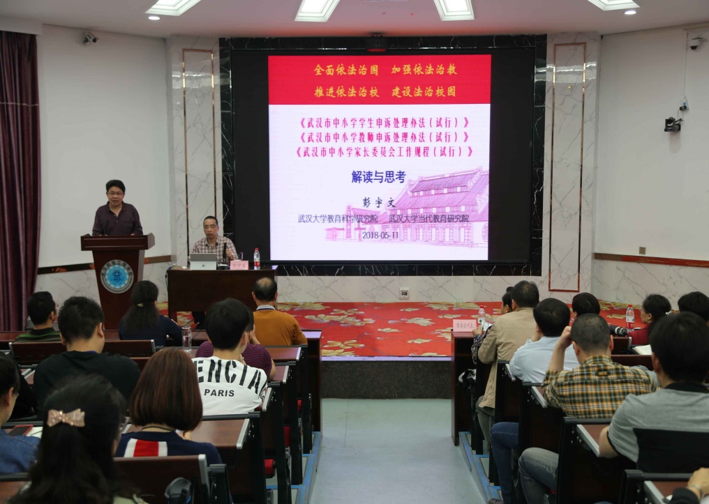 2018年是贯彻党的十九大精神的开局之年,是实施全市教育系统“七五”普法规划承上启下的关键之年。根据市教育局要求,我校积极开展《武汉市中小学学生校内申诉处理办法(试行)》、《武汉市中小学教师校内申诉处理办法(试行)》、《武汉市中小学家长委员会工作规程(试行)》三项制度试点工作。5月11日下午,学校邀请法学博士、武汉大学教育科学研究院院长宇文教授对三项制度进行解读,全体教职工及10名家长委员会代表和部分学生代表参加专题培训。