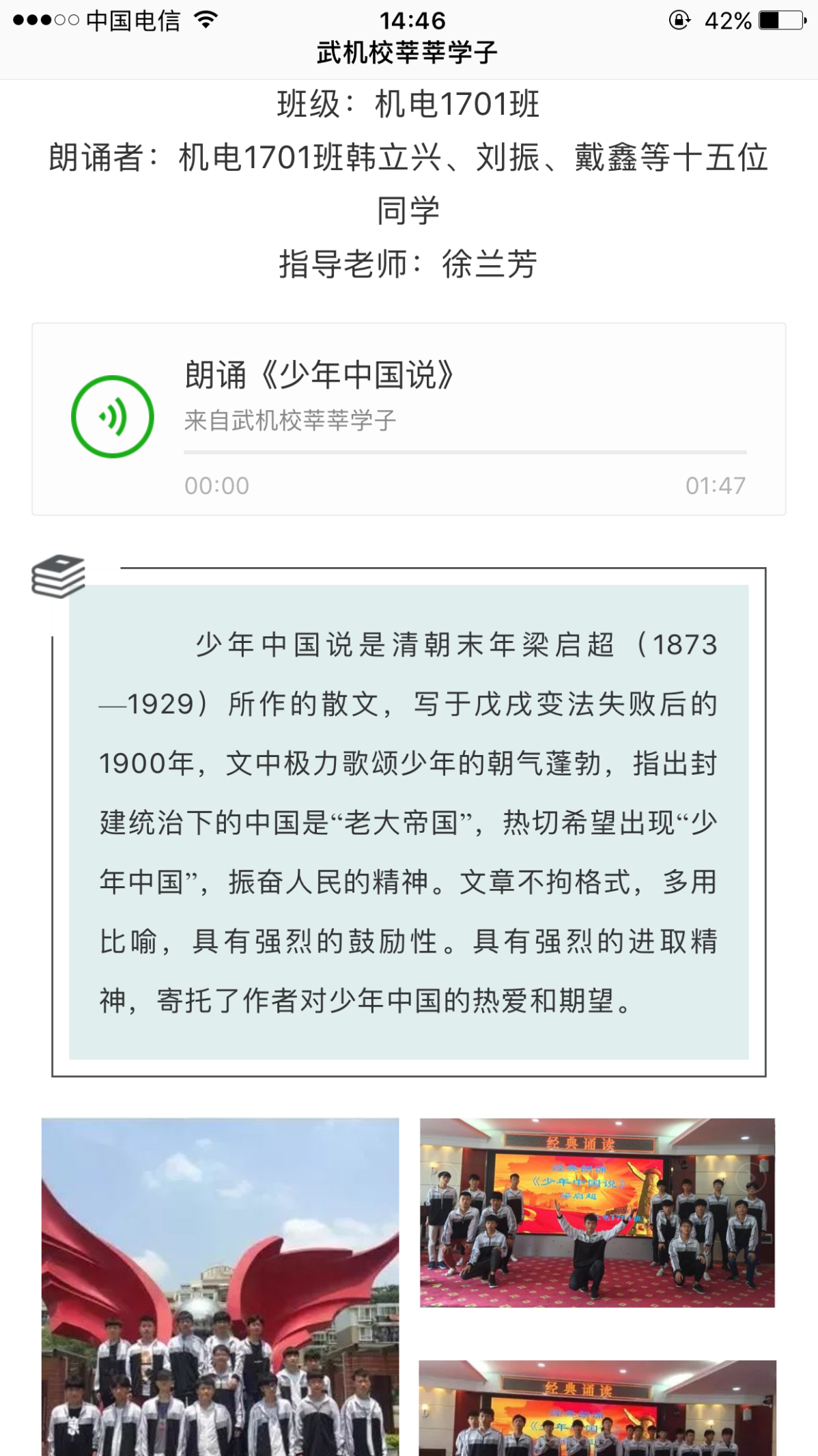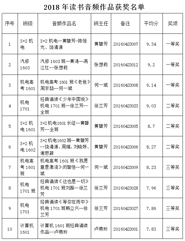 2018年4月23日我校举行校园第二届读书日系列活动,活动期间,由图书馆和学生科在全校师生中开展的“遇见经典 朗诵诗词”的音频比赛活动共收到参赛作品 30个,其中有《废墟上的敬礼》等10个优秀音频作品脱颖而出,其主题鲜明,声情并茂,形式新颖。分别评出一等奖3个,二等奖3个,三等奖4个。活动组织部门将已评选出的10部获奖作品进行后期背景设计制作并投放学校微信公众号及校园网进行展示。