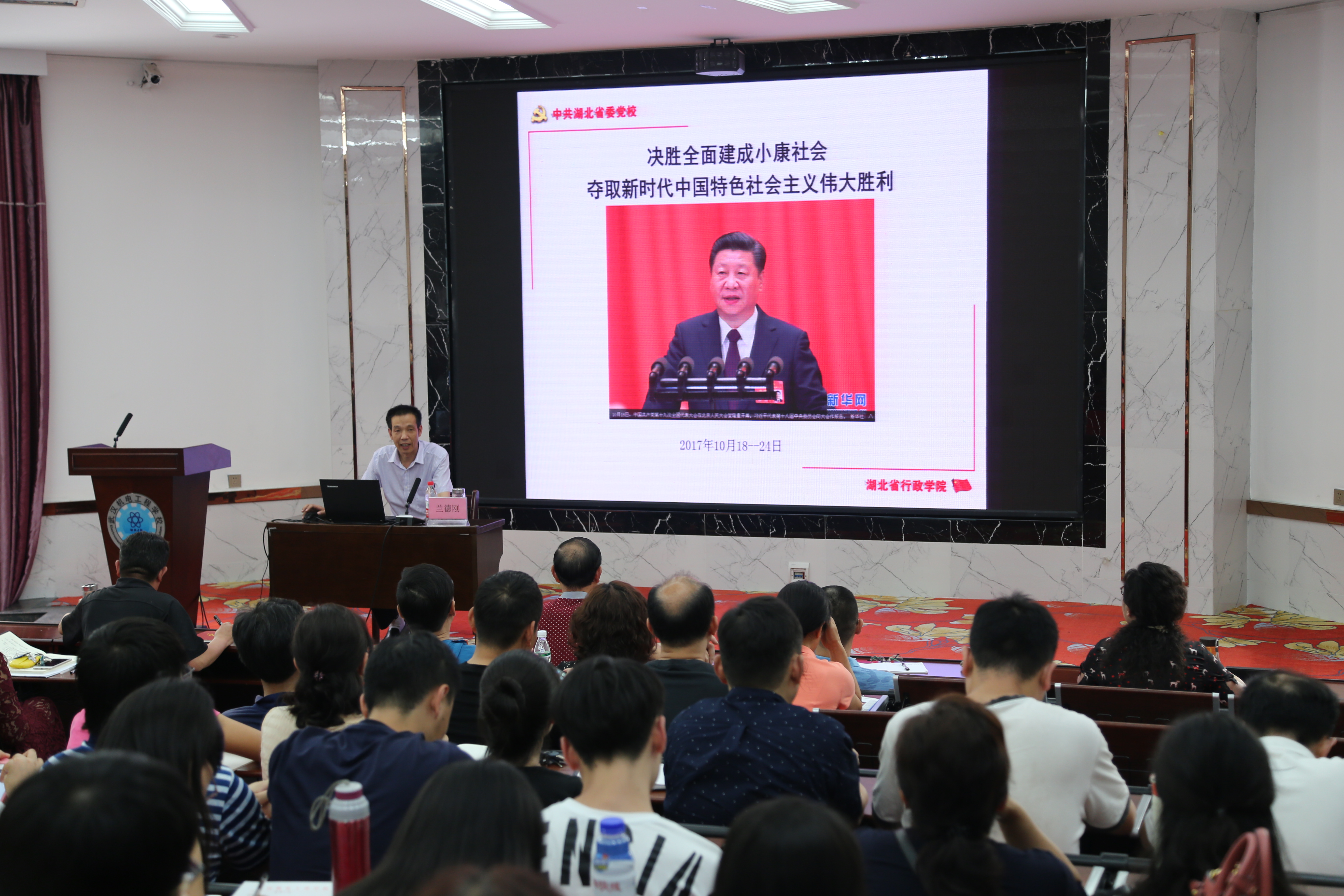 为深入学习宣传贯彻党的“十九大”精神,把“十九大”精神传达到全体党员群众中去,5月25日,我校党委邀请了中共湖北省委党校、湖北省行政学院公共管理教研部教授兰德刚同志到校作了“新时代的政治宣言和行动纲领学习十九大精神”的专题讲座,全体教职工在一楼多媒体教室聆听学习了此次讲座。
