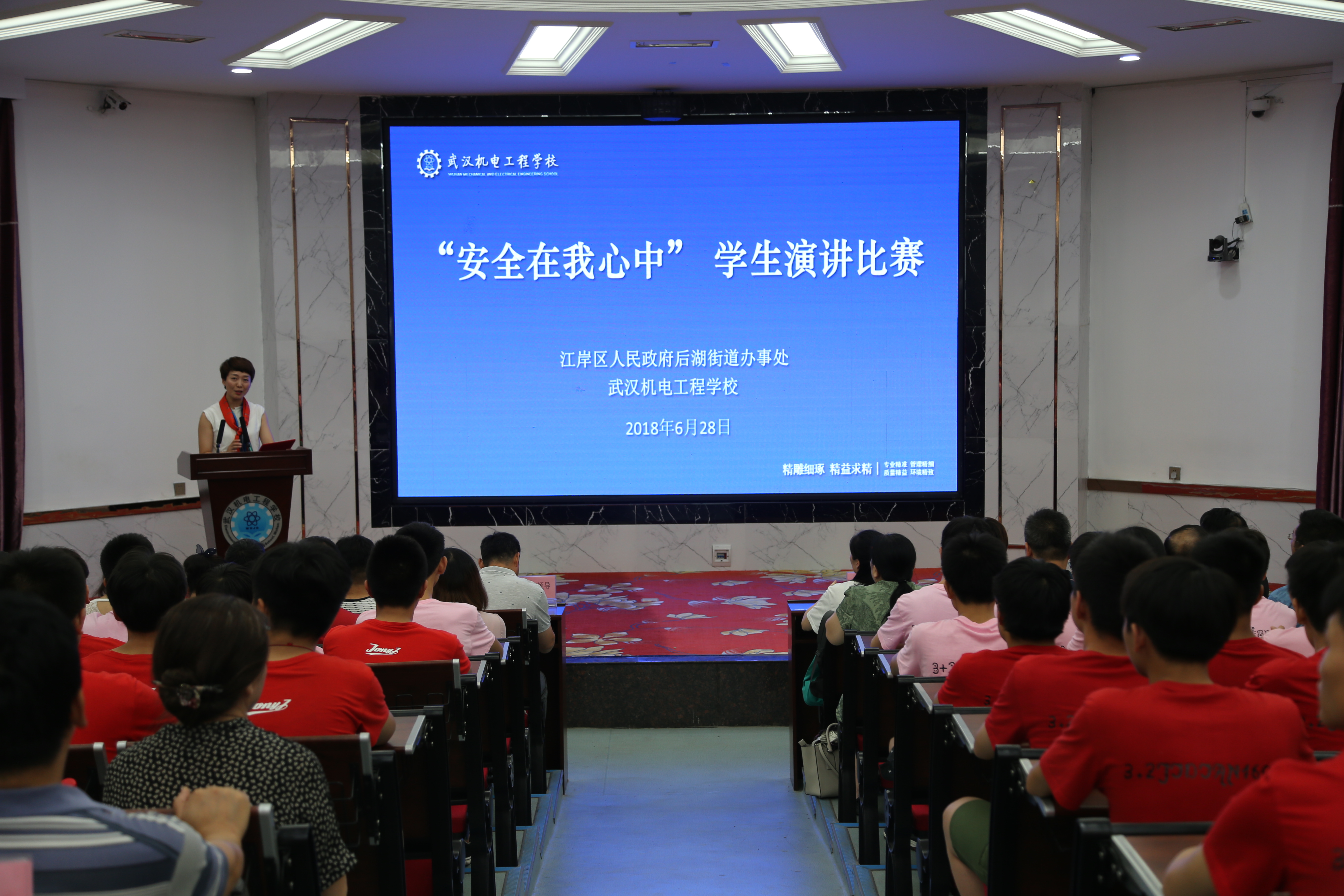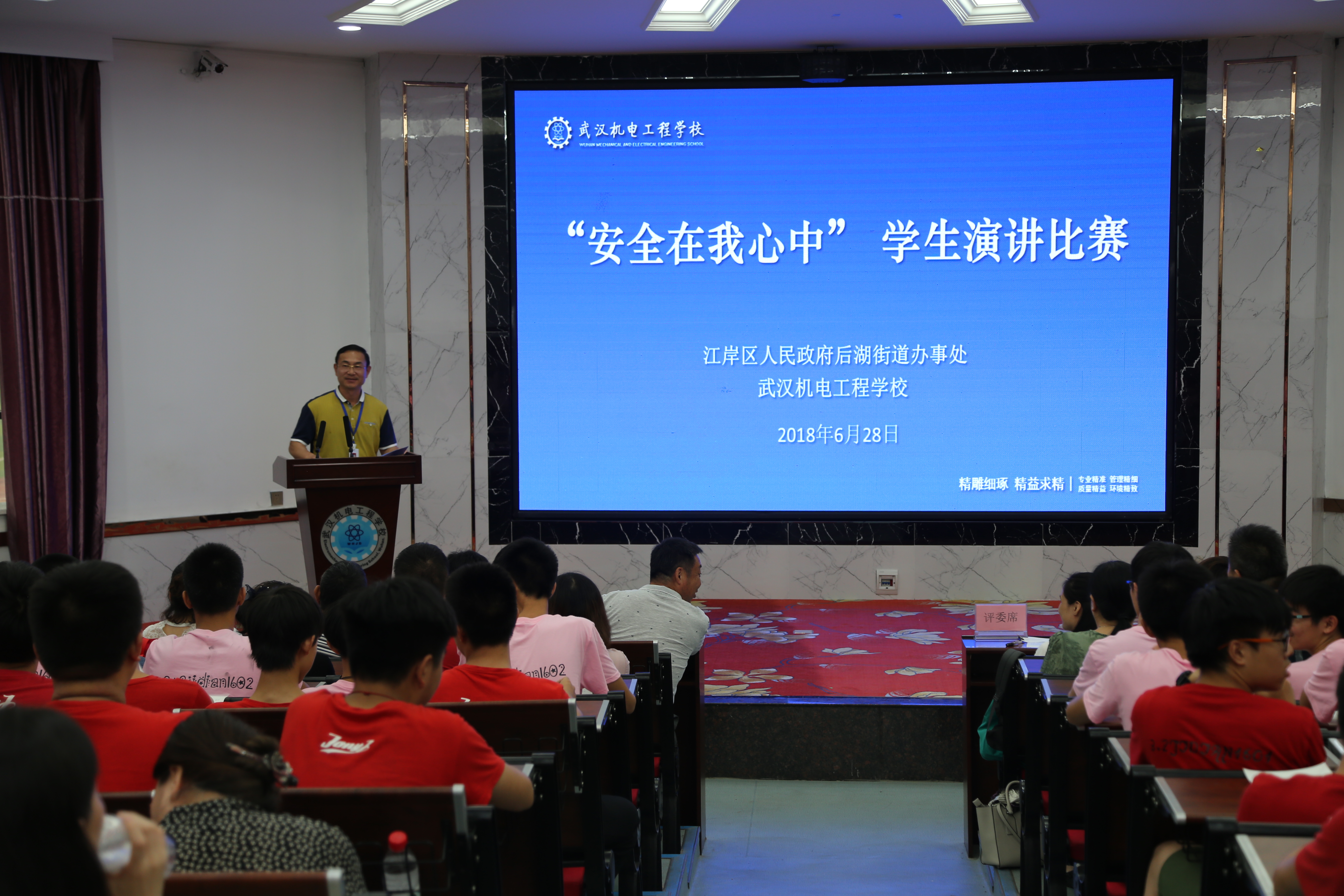 6月28日下午,我校与江岸区人民政府后湖街道办事处联合举办的2018年“安全在我心中”学生演讲比赛在教学楼一楼报告厅隆重举行,全校各班级设立了分会场,全体师生与后湖街道20余名工作人员观摩了本次比赛。