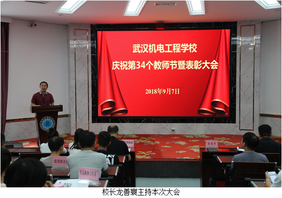 9月7日,我校全体教职工齐聚教学楼一楼报告厅,参加一年一度的教师节暨表彰大会。校长龙善寰主持本次大会。