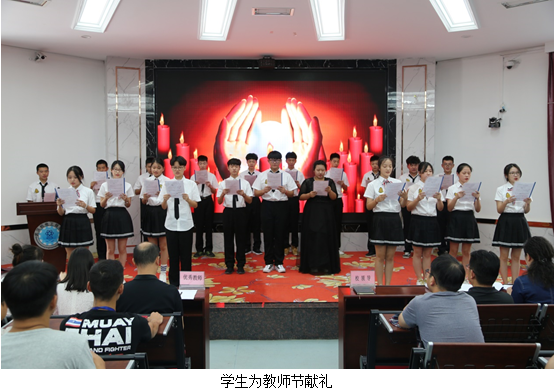 大会在学生精彩的表演中开始,首先为他们为大家献上名为《老师我们以青春的名义为您歌唱》诗歌朗诵,然后,随着伴奏音乐响起,武汉市中职好声音一等奖获得组合为全体教师富有深情的献上了一首名为《光阴的故事》歌曲,赢得了在座的阵阵掌声。