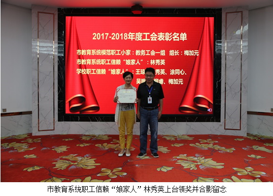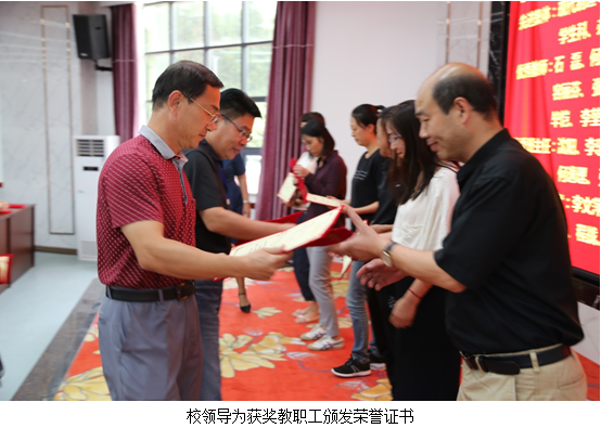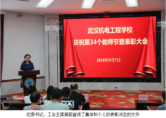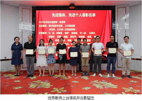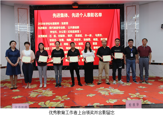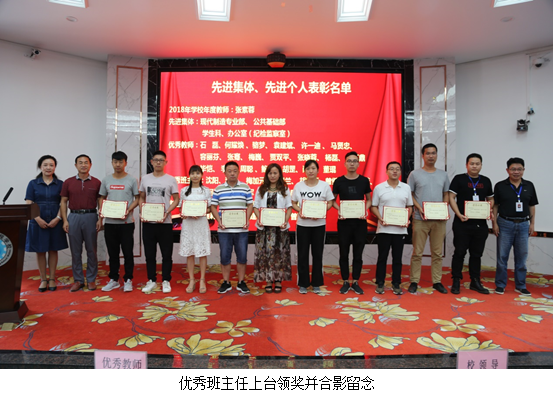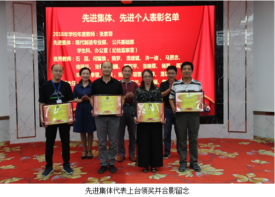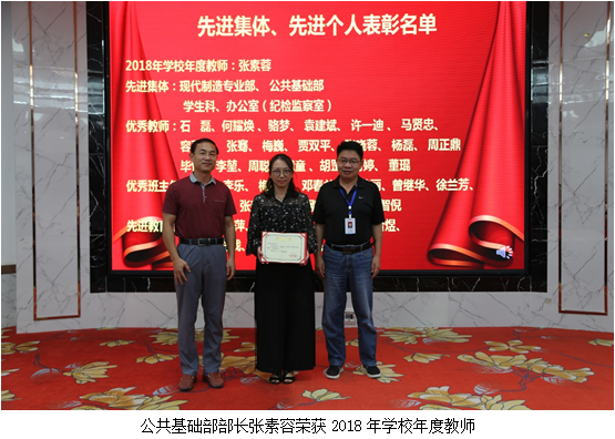纪委书记、工会主席龚蔚宣读了集体和个人的表彰决定的文件,授予公共基础部、现代制造技术专业部、学生科、办公室(纪检监察室)4个部门为“先进集体”荣誉称号。授予张素容“2018年学校年度教师”荣誉称号。授予石磊、何耀焕、骆梦、袁建斌、许一迪、马贤忠、容丽芬、毕恺、李堃、周聪、鲍童、胡罡、肖婷、董琨、张骞、梅巍、 贾双平、张晓蓉、杨磊、周正鼎等20名同志为“优秀教师”荣誉称号。授予沈阳、李乐、梅加元、邓春兰、胡桂丽、曾继华、徐兰芳、何逸理、张建军、喻志刚、唐芳、李智倪等12名同志为“优秀班主任”荣誉称号。授予李文萍、潘锐、胡欣、黄涛、闫晋煜、黄莉、程战、黄建、张尊民、曾珠等10名同志为“先进教育工作者”荣誉称号。学校对以上先进集体和先进个人予以表彰,校领导为获奖集体和个人的代表颁发荣誉证书并合影留念,鼓励他们再接再厉,再创佳绩。