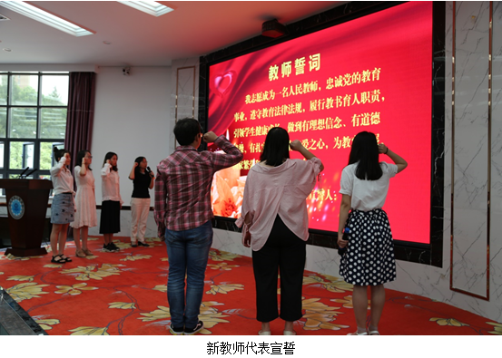 教务处主任周凌带领新进教师:姚雨言、骆梦、何耀焕等七位老师,面对教师誓词进行了庄严的宣誓。