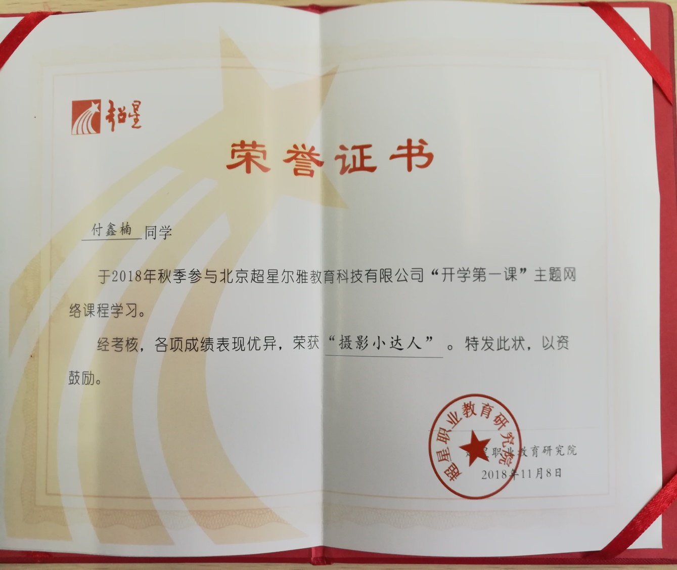 为贯彻落实《人力资源社会保障部关于印发技工教育“十三五”规划的通知》和《人力资源社会保障部办公厅关于印发〈技工院校工匠精神教育课教学大纲(试行)〉的通知》要求,大力弘扬和培育工匠精神,我校组织了一批学生参与了由超星集团主办的《工匠精神》开学第一课活动,通过学课程、拿奖励的方式,寓教于乐地让同学们正确认识和感悟工匠精神,培养了学生践行工匠精神的积极情感和自觉意识。其中,傅鑫楠同学在此次活动中荣获“摄影小达人”奖项。