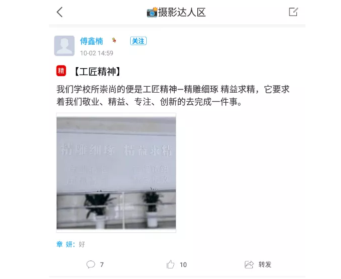 通过这一次活动,傅鑫楠同学对我校所崇尚的工匠精神有了自己的体会,她在获奖作品中热情洋溢地说道:“我们学校所崇尚的便是工匠精神——精雕细琢、精益求精,它要求我们敬业、精益、专注、创新地去完成一件事。