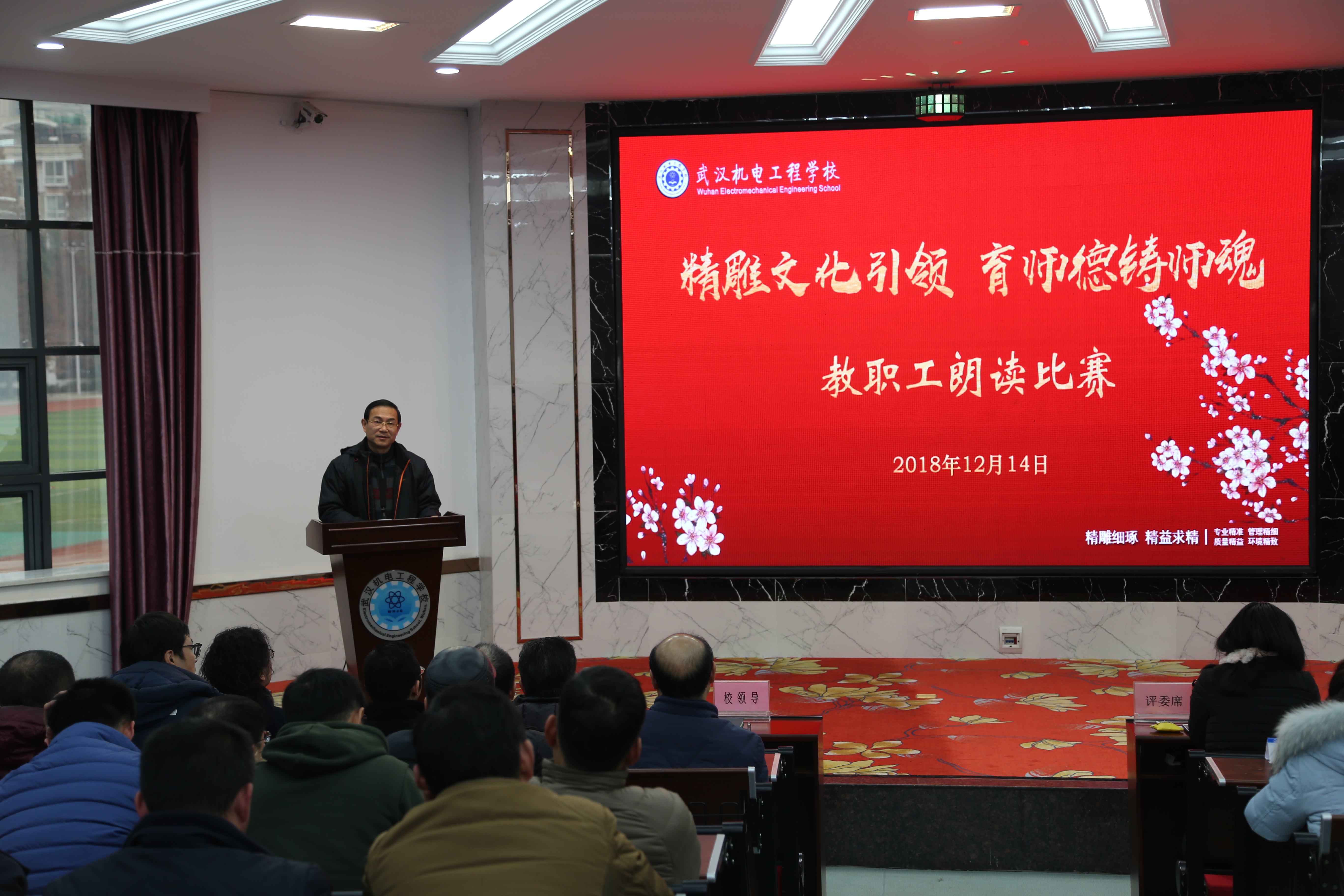为深入贯彻党的十九大精神和习近平新时代中国特色社会主义思想,弘扬“问津求真,追求卓越,立德树人”武汉教育精神,倡导我校“精雕文化”,引领广大教职工精雕细琢求发展,精益求精促质量,育师德铸师魂,提升教职工职业素养。学校语言文字办公室和校工会联合举办2018年教职工师德朗读比赛。
