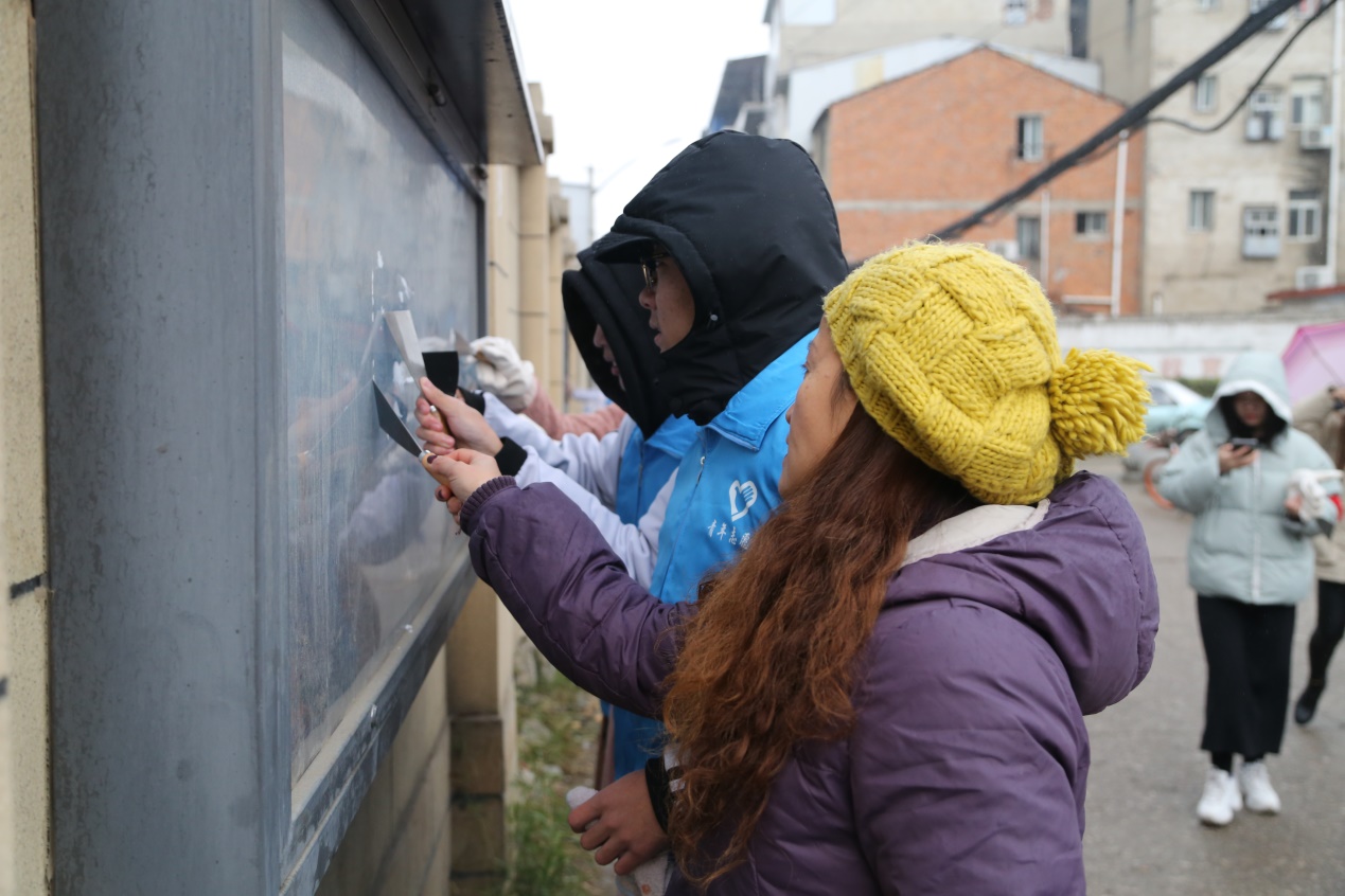 志愿者和带队徐兰芳老师认真铲除宣传栏上的小广告